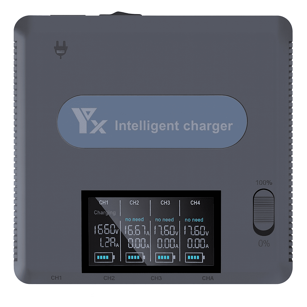 מטען מקצועי עם שני מצבי טעינה – טעינה מלאה וטעינת אחסון. מאפשר לטעון בו־זמנית עד 4 סוללות ושני חיבורי USB, עם תצוגה דיגיטלית נוחה ושלט חכם לניהול הטעינה.